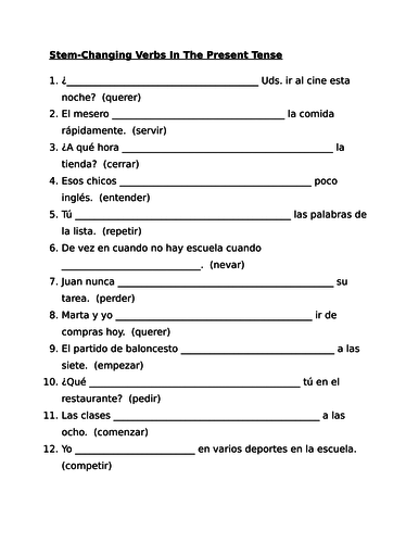 Results 1 - 24 of 181 — This is a simple worksheet intended for your Spanish students to practice stem changing verbs in the present tense.