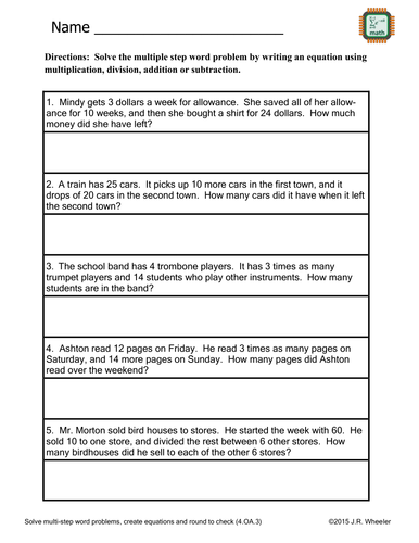 Equations and word problems two step equations these free equations and word problems worksheets will help your students practice writing and solving equations that match real world story problems. Your students will write two step equations to match problems like james earned a total of 900 last week.