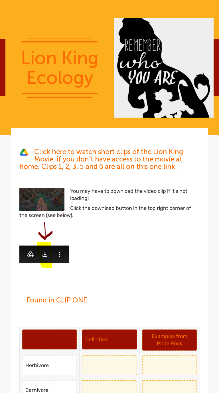 Dec 6, 2021 - Lion King Ecology Research Project and Movie Guide Download Preview File View preview above This Product Includes: -list of species of animals ...