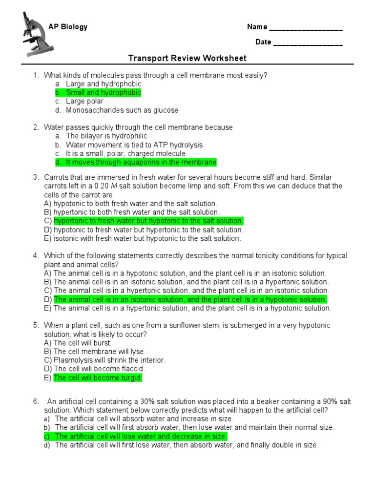 Cell transport review worksheet answer key. Cell transport review worksheet complete the table by checking the correct column for each statement. Statement isotonic solution hypotonic solution hypertonic solution causes a cell to swell x doesn t change the shape of a cell x causes osmosis x x x causes a cell to shrink x match the term with its ...