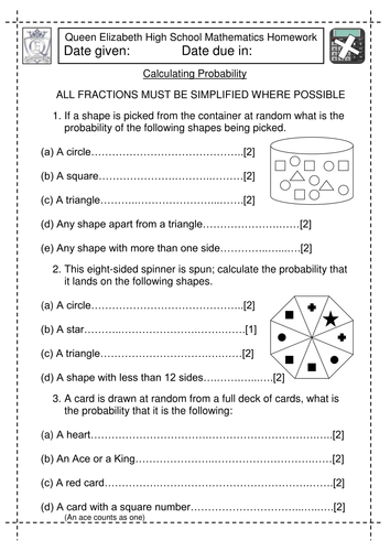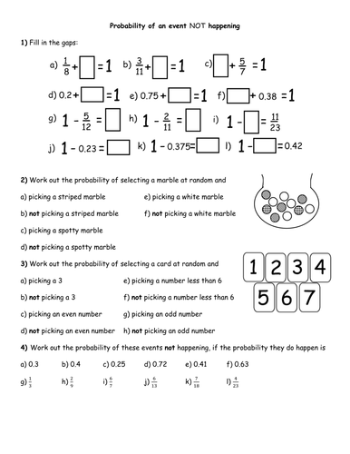 However, getting a head or tail twice in a row will be 0.25 or 0.50 x 0.50. compound probability is the combination of two simple events to achieve a compound event. The probability that coin will give you heads when tossed once is the simple event. Probability Worksheets. Subject: Mathematics. Age range: 11-14. Resource type: Lesson (complete) 4.9. 26 reviews. Dh2119's Maths Resources Shop. 4.306808510638297 593 reviews. I provide comprehensive worksheets to revise a particular topic (always with answers included) as well as extension materials, for pupils ranging from age about 11 to 16+. 1) Ann draws a colored toothpick from a jar. Without replacing it, she draws a second toothpick. 2) John rolls a six on a number cube and then flips a coin that ... 41. $1.50. PDF. This 1-page, 10-question worksheet is a great way for students to practice finding the probability of compound events! It includes both independent and dependent events. Please view the preview file to determine if this product is appropriate for your students!An answer key is included.This activity.