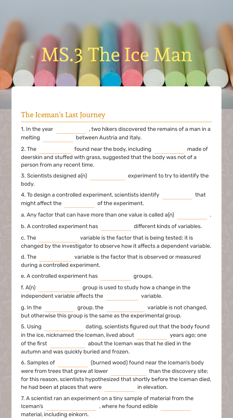 Controlled Experiments Worksheet - Teachers Pay Teachers A 4-page worksheet that introduces students to experimental design concepts. Specifically, this worksheet identifies parts of an experiment, states a definition for each, and provides an example or writing tip. I use this document as a reading and review activity that follows my PowerPoint presenta