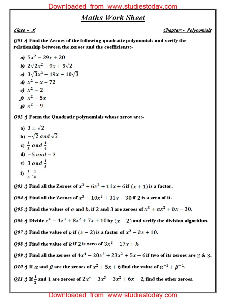 Algebra 2 Worksheets | Polynomial Functions Worksheets Factors and Zeros Worksheets This monomial and polynomial worksheet will produce problems for factoring and finding zeros. You may select the degree of the polynomials and the type of zeros to find in the problems.