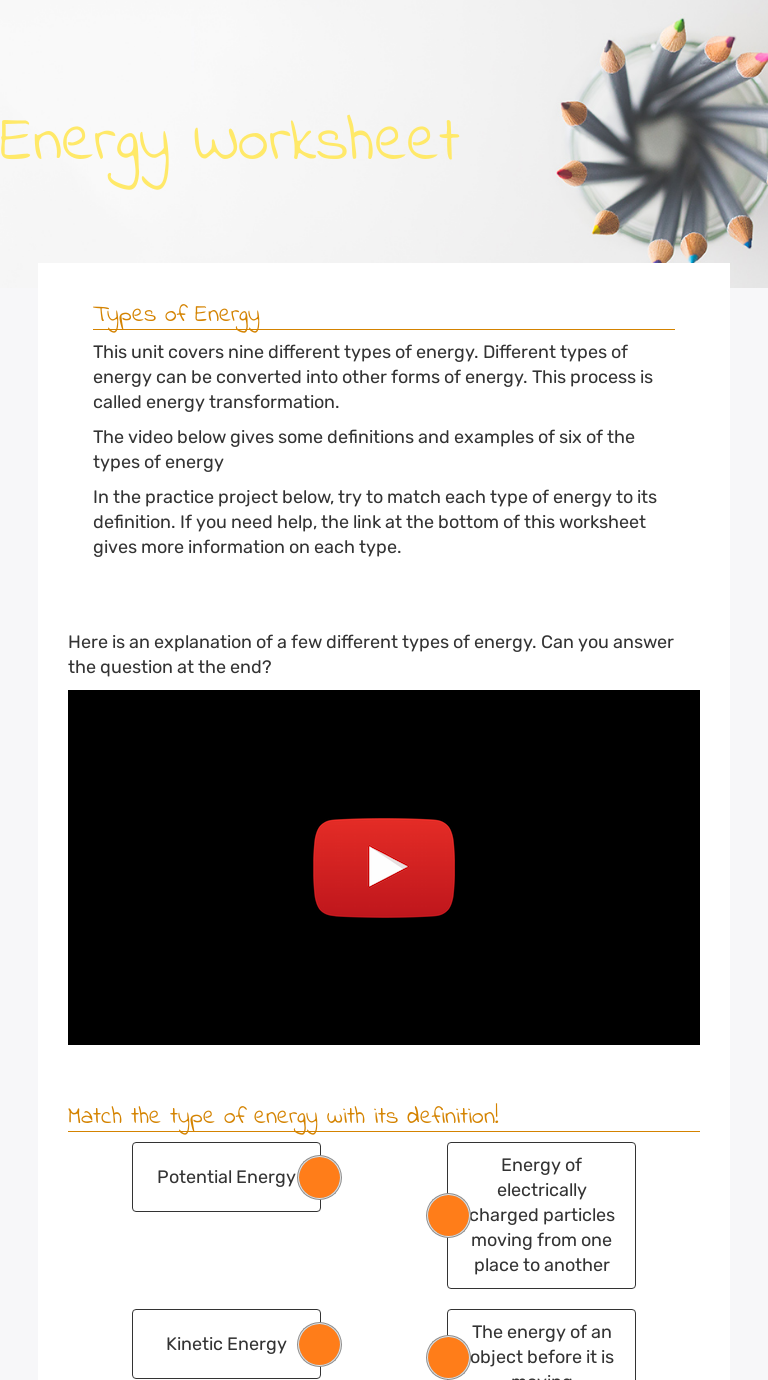 Forms of energy - Interactive worksheets maker for all ... Forms of energy Tipos de energía ID: 429867 Language: English School subject: Natural Science Grade/level: Sexto de Primaria Age: 10-12 ... More Energy interactive worksheets. MATTER 4 - Energy by tercerocossio: Energy: conductors and insulators by rocioga93: Types of Energy by soniateacher9: Types of energies