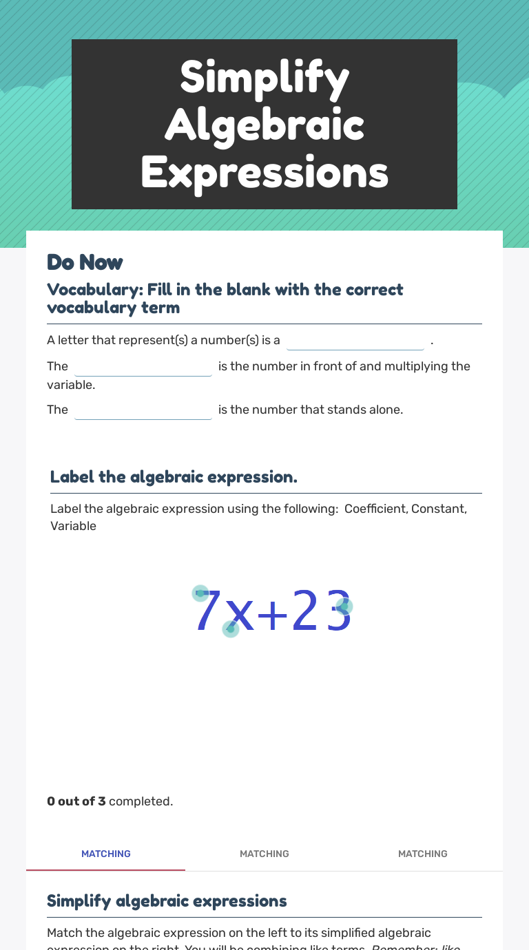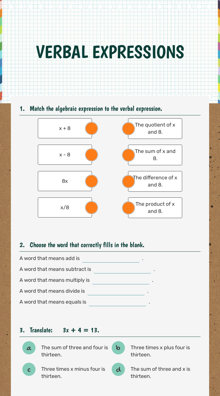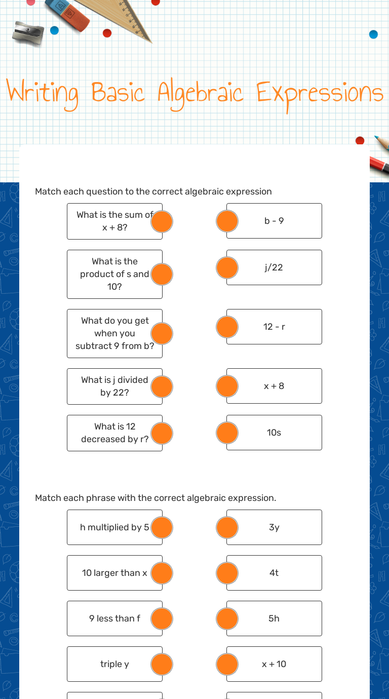 Matching up Algebraic Expressions | Interactive Worksheet by... Matching up Algebraic Expressions Worksheet. November 4, 2019. Add matching pairs. Matching Algebraic Expressions. Read the given phrase, match it to the correct mathematical expression. The sum of a number and 8. Algebraic Expressions Worksheets - Math Worksheet PDF Algebraic expressions worksheets teaches formation of expressions and translation of Translating phrases worksheets and forming algebraic expressions worksheets here are free to download. You will learn to differentiate between variables and constants, and like and unlike terms. Algebra Worksheets - Free Algebra worksheets - iPracticeMath Master algebra skills and solve algebra equations by following simple but effectively designed worksheets by iPracticeMath! Strengthen your algebra skills while having fun! Our worksheets are simple and flexible to use throughout the school year, and targeted for children in 5th grade to 8th... Algebraic Expressions Questions for Tests and Worksheets Algebraic Expressions questions for your custom printable tests and worksheets. You can create printable tests and worksheets from these Algebraic Expressions questions! Select one or more questions using the checkboxes above each question.