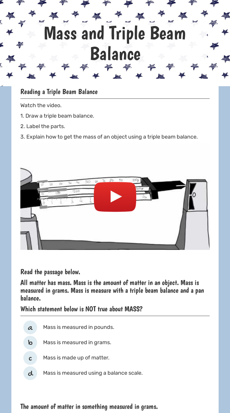 Reading a Triple Beam Balance in 2022 | Practices ... Reading a Triple Beam Balance. Use this worksheet as a guided practice, an informal assessment, or a quick quiz. Students will read the identify the mass on the pictures of triple beam balances. Teachers Pay Teachers.