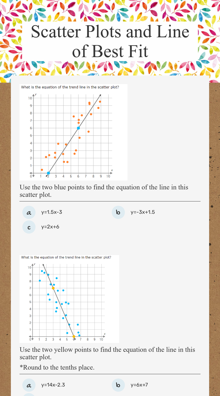 Scatter Plots and Line of Best Fit Worksheet 2 by Algebra ... This is a bundle of 6 worksheets on scatter plots, line of best fit and quadratic regression. It also includes the free download Monopoly and Line of Best Fit.Worksheet 1: Scatter plots and line of best fit.4 data sets. Students will draw scatter plot from given data and then find the line of bes 7 Products $5.95 $9.00 Save $3.05 View Bundle
