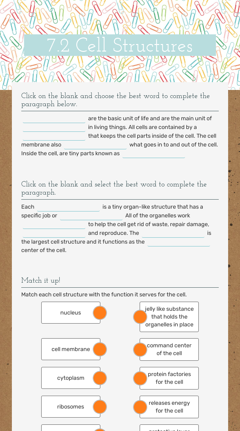 7.2 cell structure worksheet answers - Studyres Our method is the easiest way to learn Biology. 7.2 cell structure worksheet answers This is an active transport process where a vesicle inside the cell fuses with the plasma membrane to release contents to the outside of the cell:. Membrane Structure. The cell is highly organized with many functional units or.