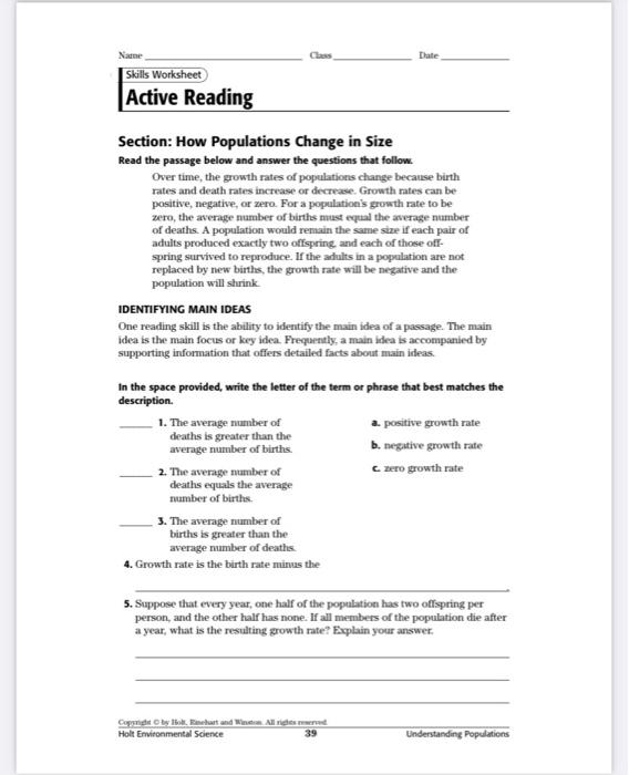 Name Class Date Skills Worksheet Active Reading Se... | Chegg.com ...Skills Worksheet Active Reading Section: How Populations Change In Size Read The Passage Below And Answer The Questions That Follow. Explain your answer. na Copyright by Holt, Rinehart and Winston. All rights reserved. Class Date Name Active Reading continued SEQUENCING...