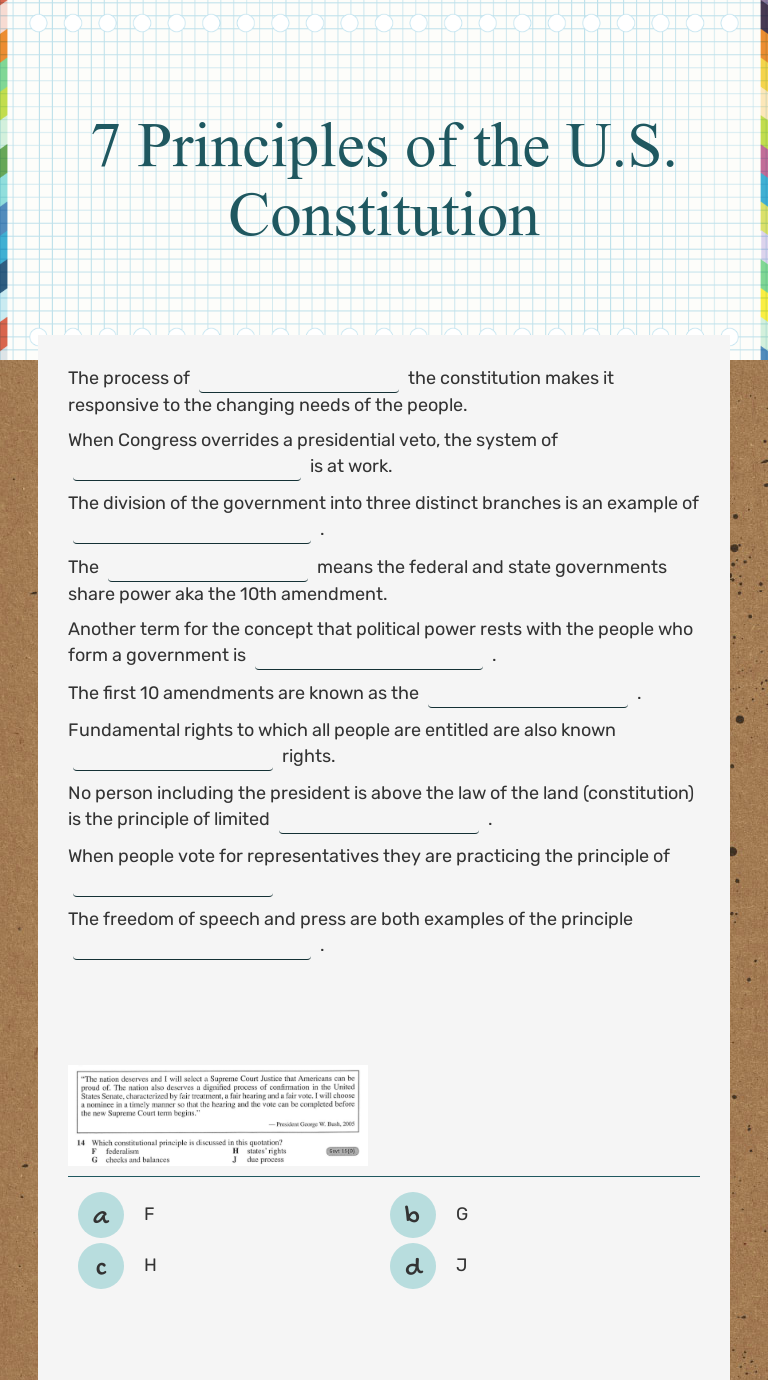 Principles of the constitution worksheet answers. Browse Printable Civics & Government Worksheets | Education.com Students take a deep dive into six of the U.S. Constitution's guiding principles with this engaging social studies worksheet! Students will read about the role of elections in civics and government, answer questions, and complete a short research project. Applying The Principles of The Constitution - Answer Key | PDF U.S History worksheet on the parts of the constitution. Separation of Powers, Checks and Balances, Popular Sovereignty, Republicanism, Limited Match each statement below with the constitutional principle it illustrates. P-popular sovereignty F-federalism S-separation of powers R-republicanism... Teaching Six Big Ideas in the Constitution | National Archives Students analyze the text of the Constitution in a variety of ways, examine primary sources to identify their relationship to its central ideas and debate the core constitutional principles as they relate to What is the significance of the Six Big Ideas in the Constitution historically and for Americans today? constitutional principles answer key - Bing Constitutional Principles Worksheet Answers Unique Prevalent Icivics Why Government Answe … Aug 03, 2021 · The Constitution Answer Key before I 1 Voluntary or Open Membership minimal Principles of OOP Key Points UPSC CSE Prelims Expected Cutoff Marks.