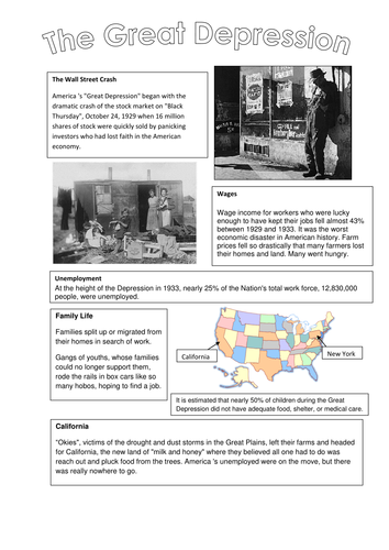 The Great Depression Unit Studies and FREE Printables ... The Great Depression was a very sad and devastating time for people in America. It effected the rich and the poor and there is so much to learn from this time in history. The Great Depression lasted for over a decade. It was from 1929-1941. It was called the Great Depression because it greatly effected so many people from all walks of life. Free K-12 Educational Materials - Worksheets, Lesson Plans ... Outlines, PowerPoints, Lesson Plans, Worksheets, Maps, and More Unit X: War, Prosperity, and Depression > U.S. History > War, Prosperity, and Depression Books and Films - Our reviews and guides for books and films covering this period in American history. Activity 7: The Great Depression - A Family's Choices ... Era 7: The Great Depression and World War II (1929 - 1945) Standard 1: The causes of the Great Depression and how it affected American society. 1B: The student understands how American life changed during the 1930s. Therefore, the student is able to: Analyze the impact of the Great Depression and the Dust Bowl on industry and workers and ...