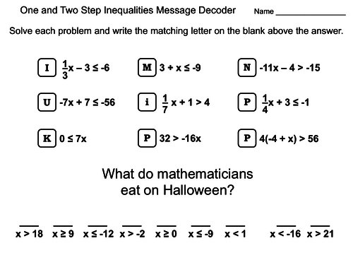 One And Two Step Inequalities Worksheet - Worksheet Smart Two step inequalities worksheets this page contains a lot of printable two step inequalities worksheets based on solving and graphing for 7th grade 8th grade and high school students. How to Solve One-Step Inequalities? (+FREE Worksheet!) Download One-Step Inequalities Worksheet Answers) Reza. Reza is an experienced Math instructor and a test-prep expert who has been tutoring students since 2008. He has helped many students raise their standardized test scores--and attend the colleges of their dreams. He works with students individually and in group settings, he tutors both live and online Math courses … _Inactive Rees, Hayley / 6 Solving Inequalities This is the worksheet given to Blocks 1 & 3 to practice solving one-step inequalities with decimals and fractions. If you choose to print this worksheet, be sure to print with the highest quality setting. If you don't, the inequalities and number lines will be very faint. (I speak from experience.) One Step Inequalities Worksheets & Teaching Resources | TpT Solving One Step Inequalities Word Problems Puzzle by Teaching in an Organized Mess 346 $3.50 Zip Solving One Step Inequalities PuzzleFor students learning how to solve and graph inequality word problems, they can practice with this puzzle and can self check. ***There are 3 versions included.