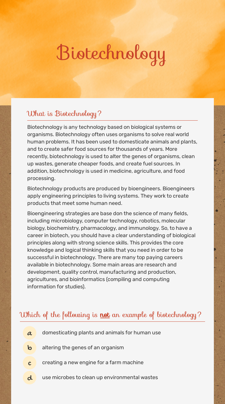 PDF Impact of biotechnology worksheet answers 24 Honors Biology - Section 15.4, p. 367 This is a whole new era where we move beyond small changes in individual genes to be able to write what If we could get satellite images of the tiny world, the impact of biotechnology would be no less obvious. The majority of the food we eat comes from...