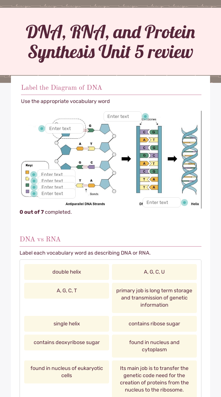 Dna & Protein Synthesis Review Worksheet Answers 2021 ... the following protein synthesis worksheets are intended for use with these ngss standard: the genetic code is the key for the conversion of dna nucleotide sequences and therefore rna nucleotide sequences into the amino acids sequences that compose proteins.then we can use a chemical reaction known as deoxyribonucleic acid to.there are some great … IB Protein Synthesis Review Key (2.7-7.2-7.3) - SlideShare Review worksheet answer key covering IB Biology content on Transcription and Translation (Topics 2.7, 7.2, and 7.3) SlideShare uses cookies to improve functionality and performance, and to provide you with relevant advertising. 41 protein synthesis simulation worksheet answers ... Protein Synthesis Worksheet Answer Key Part A Protein Synthesis Simulation - Maryland Sea Grant. 2 hours ago Protein Synthesis flow chart - for writing summary Protein Synthesis flow chart - teacher page with answers. Procedures: Review the structure of DNA - students should use the small puzzle pieces to construct the DNA puzzle, while... worksheets.theteacherscorner.net › make-your-ownCrossword Puzzle Maker | World Famous ... - The Teacher's Corner Our crossword puzzle maker allows you to add images, colors and fonts to create professional looking printable crossword puzzles. No registration needed to make free, professional looking crossword puzzles!