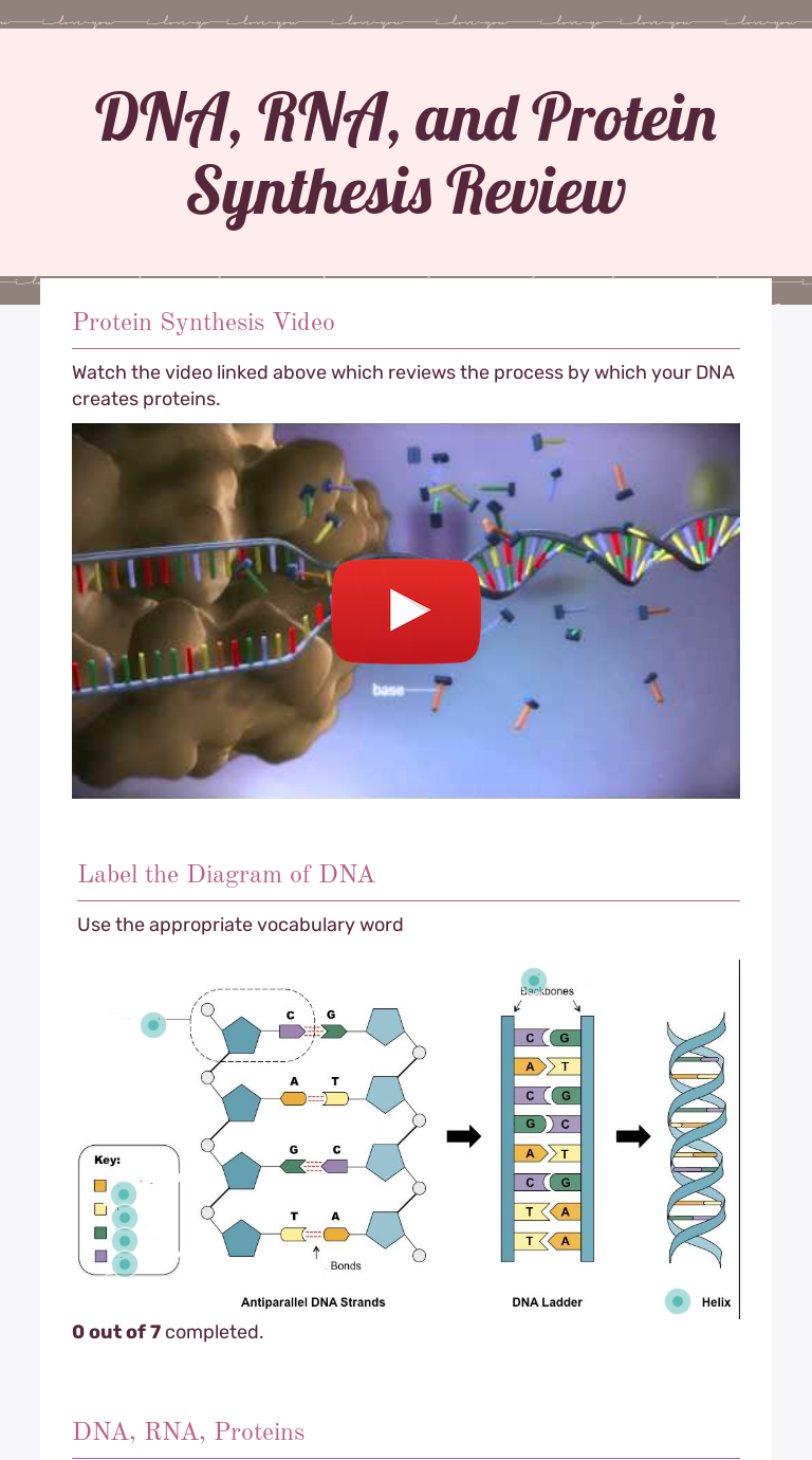 Protein Synthesis Interactive Review worksheet ID: 1351222 Language: English School subject: Biology Grade/level: 9th to 12th Grade Age: 14+ Main content: Protein synthesis, Transcription, Translation, Codon, Anticodon Other contents: Central Dogma Add to my workbooks (33) Download file pdf Embed in my website or blog Add to Google Classroom Protein Synthesis - ANSWERS Step 1: Transcription: convert the DNA code to mRNA code. Step 2: Translation: translate your mRNA code into an amino acid sequence using the circular chart on ...5 pages Protein Synthesis Transcription And Translation Worksheet ... Protein synthesis is the process used by the body to make proteins. The results for protein synthesis worksheet answer key. During transcription mrna transcribes copies dna. The first part of protein synthesis is takes place in the where dna is decoded onto leaves through a goes to a the 2nd part of protein synthesis is where.