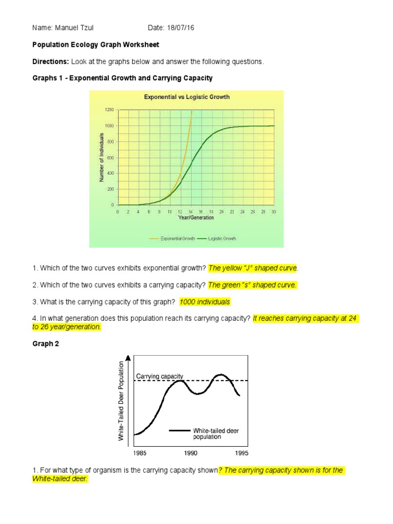 Population-Ecology-Graph-Worksheet Answers A P | PDF ... Population Ecology Graph Worksheet Directions: Look at the graphs below and answer the following questions. Graphs 1 - Exponential Growth and Carrying Capacity. 1. Which of the two curves exhibits exponential growth? The yellow J shaped curve. 2. Which of the two curves exhibits a carrying capacity? The green s shaped curve. 3.