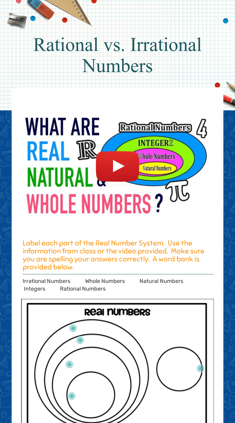 Real Number System Worksheet Teaching Resources | TpT The Real Number System: Classifying Real Numbers Venn Diagram Worksheet. by. Algebra Funsheets. 11. $1.50. PDF. This is a real numbers venn diagram worksheet. Students will classify natural/counting, whole, integers, rational and irrational numbers. Numbers can be cut/paste into diagram or simply written in.