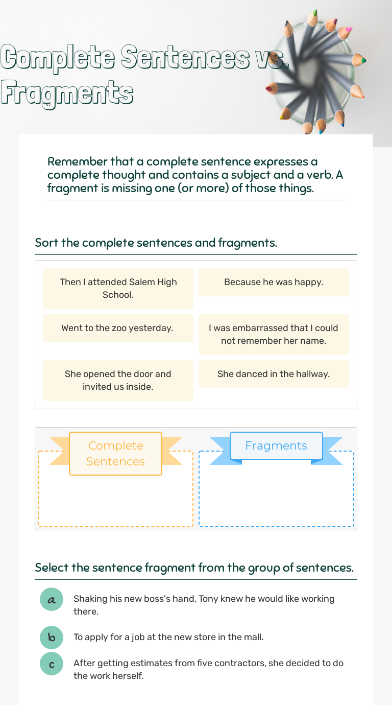 Complete Sentences and Fragments worksheet Live worksheets > English > English as a Second Language (ESL) > Sentence structure > Complete Sentences and Fragments. Complete Sentences and Fragments. Students distinguish between complete sentences and fragments. ID: 2604114.