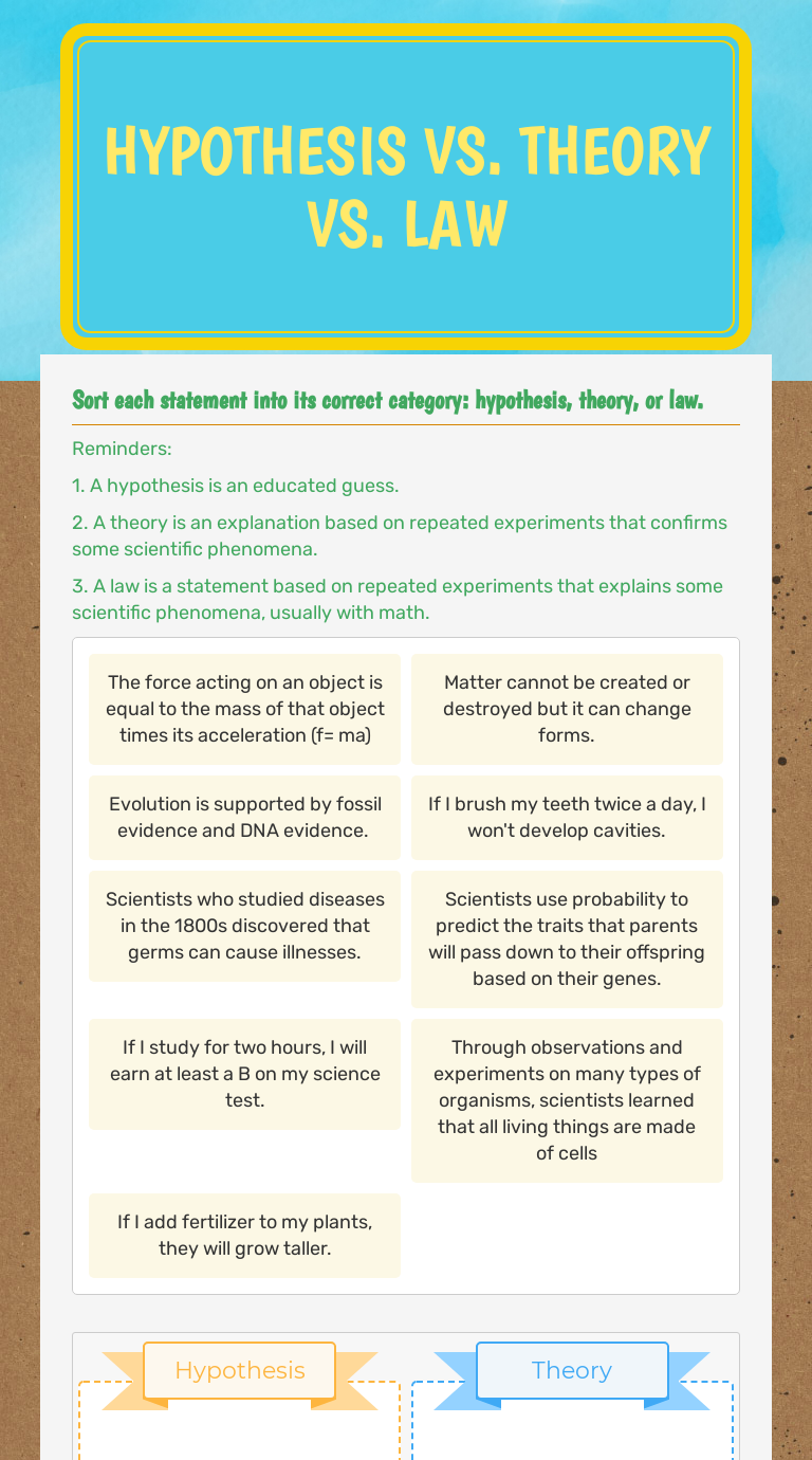 Scientific Law and Theory Lesson Plans & Worksheets Theories, Hypothesis, Laws, Facts & Beliefs. For Students 8th - 10th. In this scientific statements learning exercise, students are given 35 statements and they are to identify if each statement is a fact, law, hypothesis, theory or belief. Get Free Access See Review.