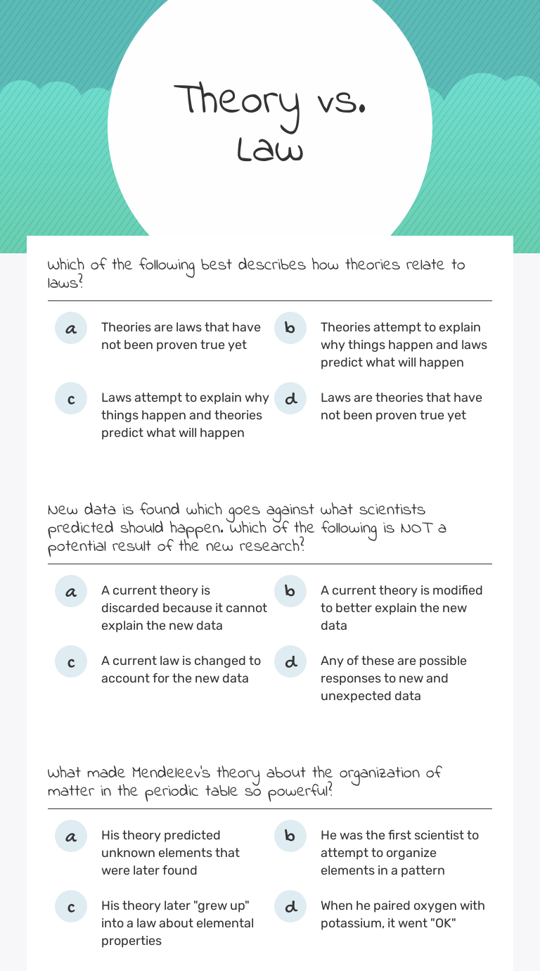 Theory vs. Laws | Other Quiz - Quizizz To play this quiz, please finish editing it. 10 Questions Show answers. Question 1. SURVEY. 30 seconds. Q. Joe tells Mai his theory about why sea turtles nest on the beach instead of in the ocean. He says, "The turtle eggs would sink to the bottom of the ocean, and the baby turtle would drown.". Joe says his uncle, a fisherman, told Joe ...