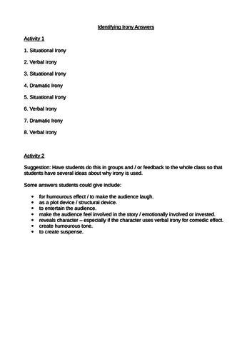 Understanding Irony | Read Write Think Students watch YouTube videos to categorize information on a graphic organizer, apply the knowledge from those videos to outside examples of irony, read short stories which employ the three types of irony, and ultimately demonstrate their ability to apply irony to our modern world. Irony Lesson Plan - Video & Lesson Transcript | Study.com Irony is a type of literary device that uses contradiction and opposite meaning to make a point or convey humor. Explore a lesson plan for teaching students about irony, including materials ... Irony Worksheets | Ereading Worksheets Irony Worksheet 3 This worksheet has six more practice problems. Students read the passage, determine whether it is using situational, dramatic, or verbal irony. They then explain their answers. Suggested reading level for this text: Grade 6-10. Irony Worksheet 3 Links Preview Edit Print Answers Online Irony Worksheet 4