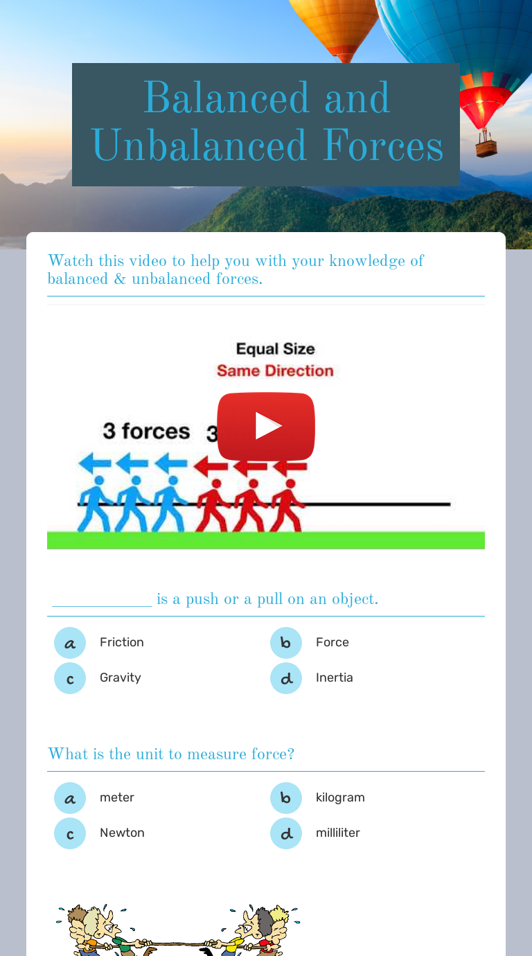 Balanced Vs Unbalanced Forces Worksheet Balanced vs unbalanced forces worksheet. The forces on the balloon are balanced unbalanced the balloon will start to move up stay where it is start to move down. A moving to the right through the air. Two teams to hold the pole in the BalancedUnbalanced Forces Kit and once in place start pushing against each other.