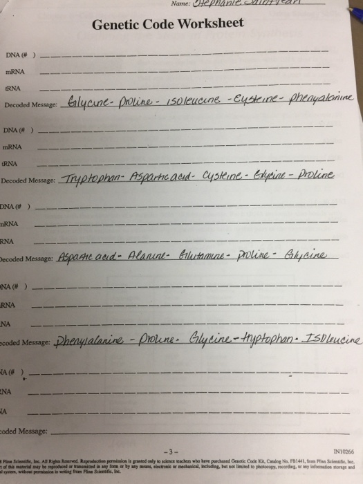 The_genetic_code_worksheet.doc - Name _ Class _ Date _ The ... View Homework Help - The_genetic_code_worksheet.doc from BIOLOGY THZDFY at Bridgeport High School, Bridgeport, WV. Name _ Class _ Date _ The Genetic Code 1. Genetic information is stored and 6 - The Genetic Code Worksheet answers.pdf - The Genetic ... View 6 - The Genetic Code Worksheet answers.pdf from BIO 1031 at Universidad Central de Venezuela. The Genetic Code & Mutations Worksheet (answers) 1. 3' - TAC TTA CTC GTC TTG - 5' RNA: 5 ' The Genetic Code Worksheet Some of the worksheets for this concept are dna base pairing work activity 1 work warm up genetic code the genetic code activity dnas secret code video work genetic engineering will change work dna rna and protein synthesis characteristics of living things. Copy each amino acid code word on one side of an index card. PDF BF#10881 Decoding Genetics - Weebly Decoding the Genetic Code Worksheet 1. Carefully copy (no mutations!) the assigned DNA genetic code onto the worksheet. 2. Transcribe the DNA code "sentence" to the mRNA code while inside the nucleus. 3. Next, transport the mRNA code through a nuclear pore to a ribosome outside the nucleus. Each ribosome contains a com-