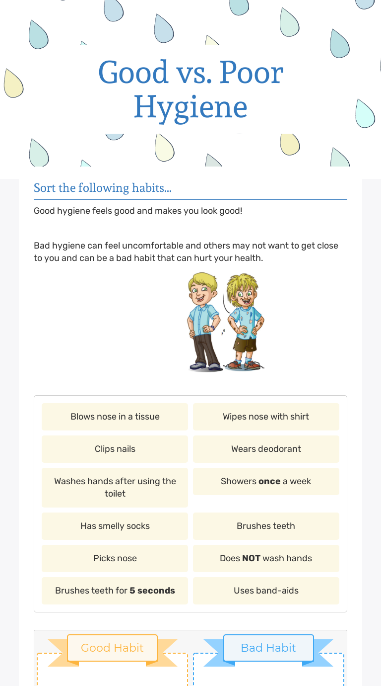Good bad habits worksheet ID: 258730 Language: English School subject: SCIENCE Grade/level: 2ND GRADE Age: 6-8 Main content: Taking care my body Other contents: HABITS Add to my workbooks (11) Download file pdf Embed in my website or blog Add to Google Classroom