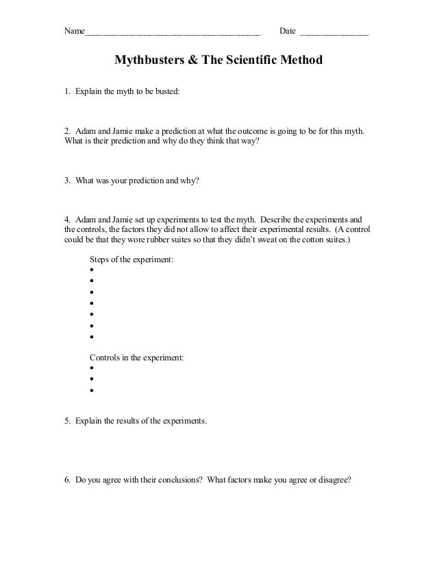 The Mythbusters Use the Scientific Method Mythbusters. Did you realize that a version of the Scientific Method is always used to conduct ... You will complete the worksheet for each episode watched.2 pages mythbusterswkst.pdf - The Science Spot What myth or legend are they investigating? Pick one if there are more than one in the clip you are viewing. 3. What did they know before they began ...1 page