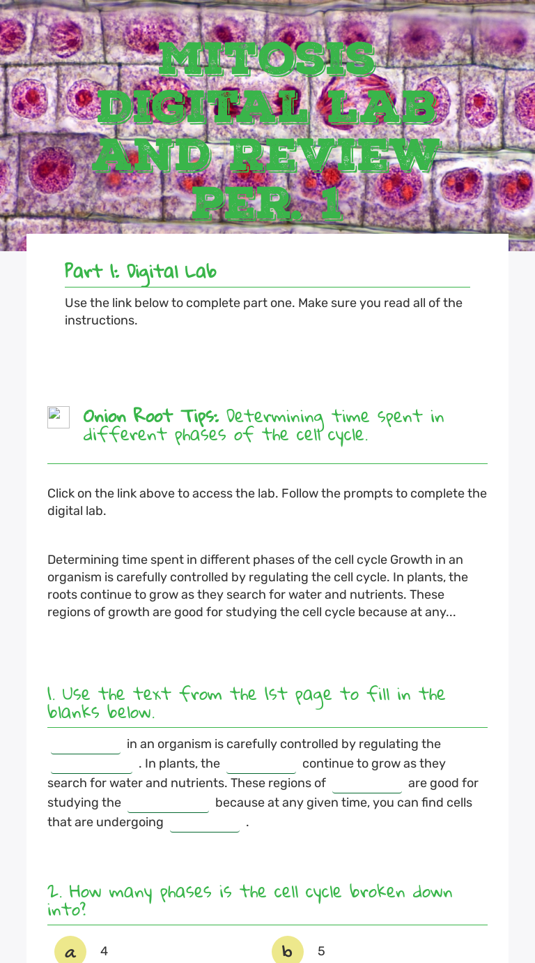 Onion Mitosis Worksheet 2 Onion Cell Mitosis Mrs. Keadle JH Science For the following questions, you may look back through your notes, open power points we have used or use the digital lesson. You should be able to answer them based on what we have learned in class. 12 Why does cell division take place in unicellular... Onion Cell Mitosis Worksheet Answers The Cell Mitosis Worksheet Answers is a set of questions that will help you determine if a given cell is functional. A worksheet comprises various exercises related to similar grammar concepts helping you to practice and read a number of examples so that they can understand its use and utilize it later... zipworksheet.com › icivics-the-constitutionIcivics The Constitution Worksheet Answers Dec 30, 2021 · Icivics The Constitution Worksheet Answers. Icivics The Constitution Worksheet Answers. Delightful to help my website, on this time I will show you concerning Icivics The Constitution Worksheet Answers. Why don't you consider picture over? is that will wonderful???. if you believe consequently, I'l t explain to you several image all over again under: So, if you desire to acquire the Mitosis in Onion Root Tip Cells. Interphase Onion root tip mitosis... Presentation on theme: "Mitosis in Onion Root Tip Cells. 4 Prophase Onion root tip mitosis chromatin in nucleus begins to condense and becomes visible under light microscope spindle fibers (microtubules) attach to centromeres of chromosomes nuclear envelope starts to break down.