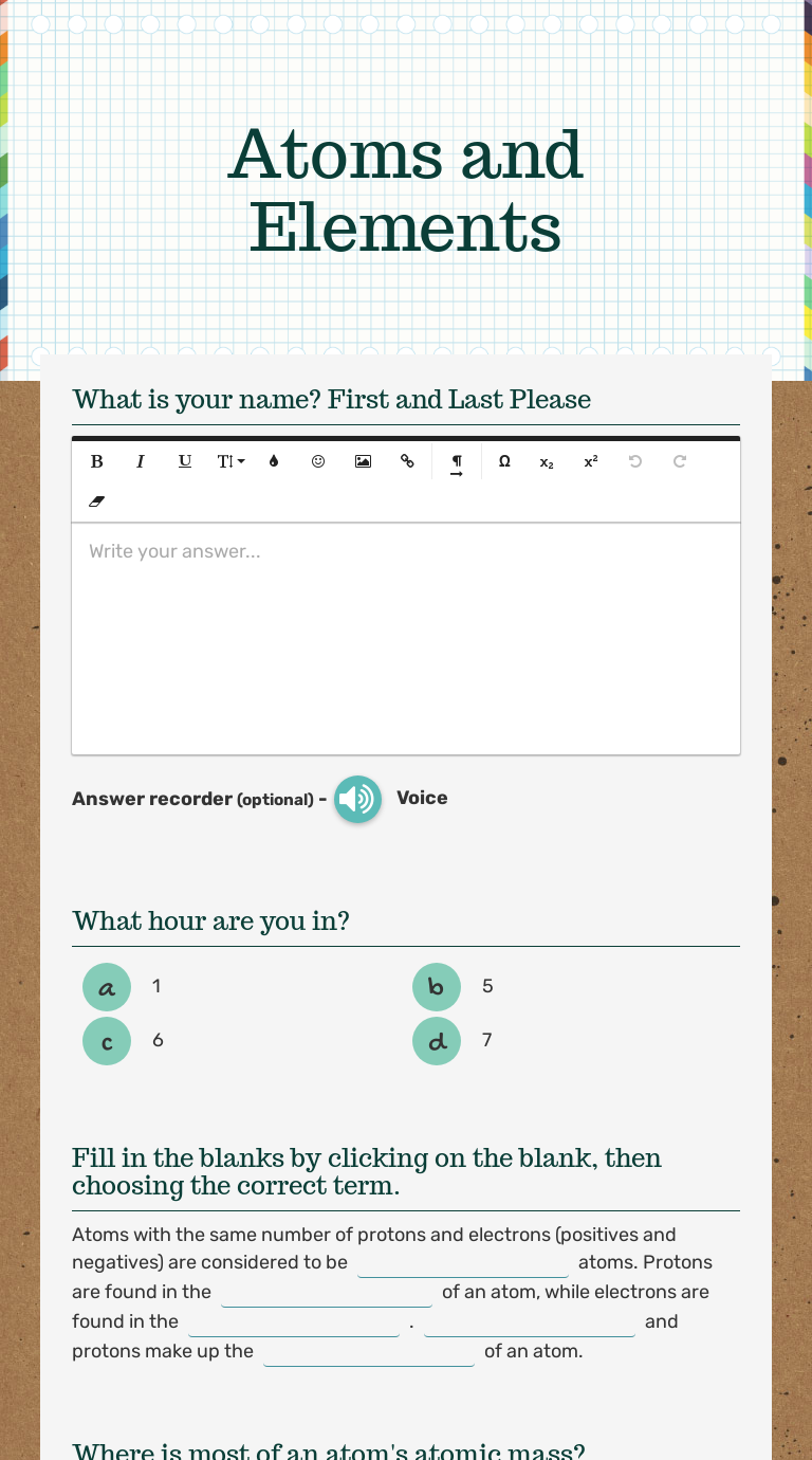 Atoms worksheets and online exercises Atoms worksheets and online activities. Free interactive exercises to practice online or download as pdf to print. Live worksheets > English > Science > Atoms.