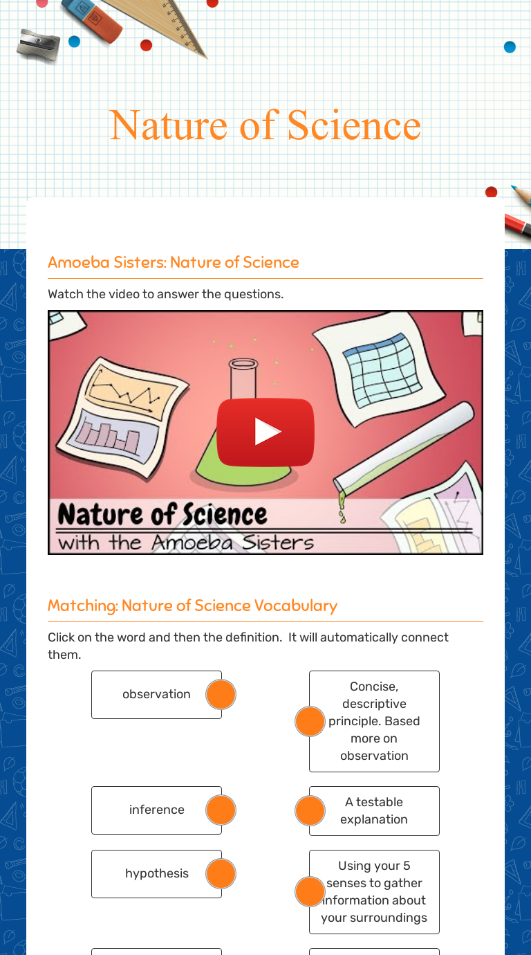 Nature Of Science Worksheets & Teaching Resources | TpT 8. $9.50. Zip. Teach your students to think like a scientist! This is a complete unit for teaching about the science process skills and the nature of science, including an 8-page informational text. The unit includes teaching notes with 12 lesson plans, pieces for the lapbook, a unit test, and a 119-slide PowerPoi. The Nature of Science - Weebly cepts of the chapter. There is one worksheet for each section, or lesson, of the chapter. The Reinforcement worksheets are designed to focus primarily on science content and less on vocabulary, although knowledge of the section vocabulary supports understanding of the content. The worksheets are designed for the full range of students; however ...