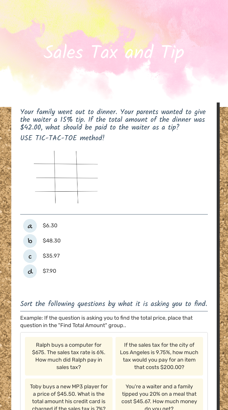 Sale Tax And Tip Teaching Resources | Teachers Pay Teachers Printables, Worksheets Sales Tax, Tip, and Discount Task Cards by Live Love Math 230 $3.00 PDF This is a set of 20 task cards to practice the concept of percents and real-world problems. The problems cover sales tax, discount, and tip and several problems include more than one step.