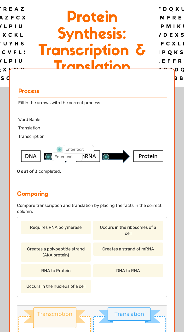 Dna Transcription And Translation Worksheets - Learny Kids Displaying top 8 worksheets found for - Dna Transcription And Translation. Some of the worksheets for this concept are Dna transcription, Practicing dna transcription and translation, Dna transcription translation work answers, Cell cycle dna replication transcription translation, Dna replication and transcription work, Protein synthesis review work, Dna rna replication translation and ... Transcription And Translation Worksheets - Worksheet Student Transcription and Translation Worksheet For each of the following sequences fill in either the DNA the mRNA codons the tRNA anticodons or the amino acid sequences that have been left blank. Use first 3 letters of amino acids for AA. Article aug 21 2019 by molly campbell science writer technology networks. DOC Transcripton/Translation Worksheet What are the three differences between RNA and DNA? 7. Where is DNA found in the cell? Where is RNA found in the cell? 8. Name the three types of RNA and what they do. Draw an mRNA strand that is complementary to the DNA strand AATTGC. Circle a nucleotide. What are the steps of transcription? Worksheet : Transcription And Translation Worksheet ... Transcription And Translation Worksheet Answers Biology Corner. Home > Worksheet > Transcription And Translation Worksheet Answers Biology Corner. Published at Saturday, March 19th 2022, 14:51:00 PM. Worksheet. By Andrea Rose. Most Downloaded Pictures of The Month. Like Worksheet Kindergarten.