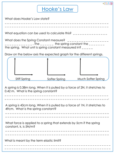 Hooke's law worksheet|KS3 Physics|Teachit This worksheet is perfect as a homework activity. It explores Hooke's Law through the results of an investigation. Students use the data provided to find the extension of a spring and then to plot a graph. Answers are included.
