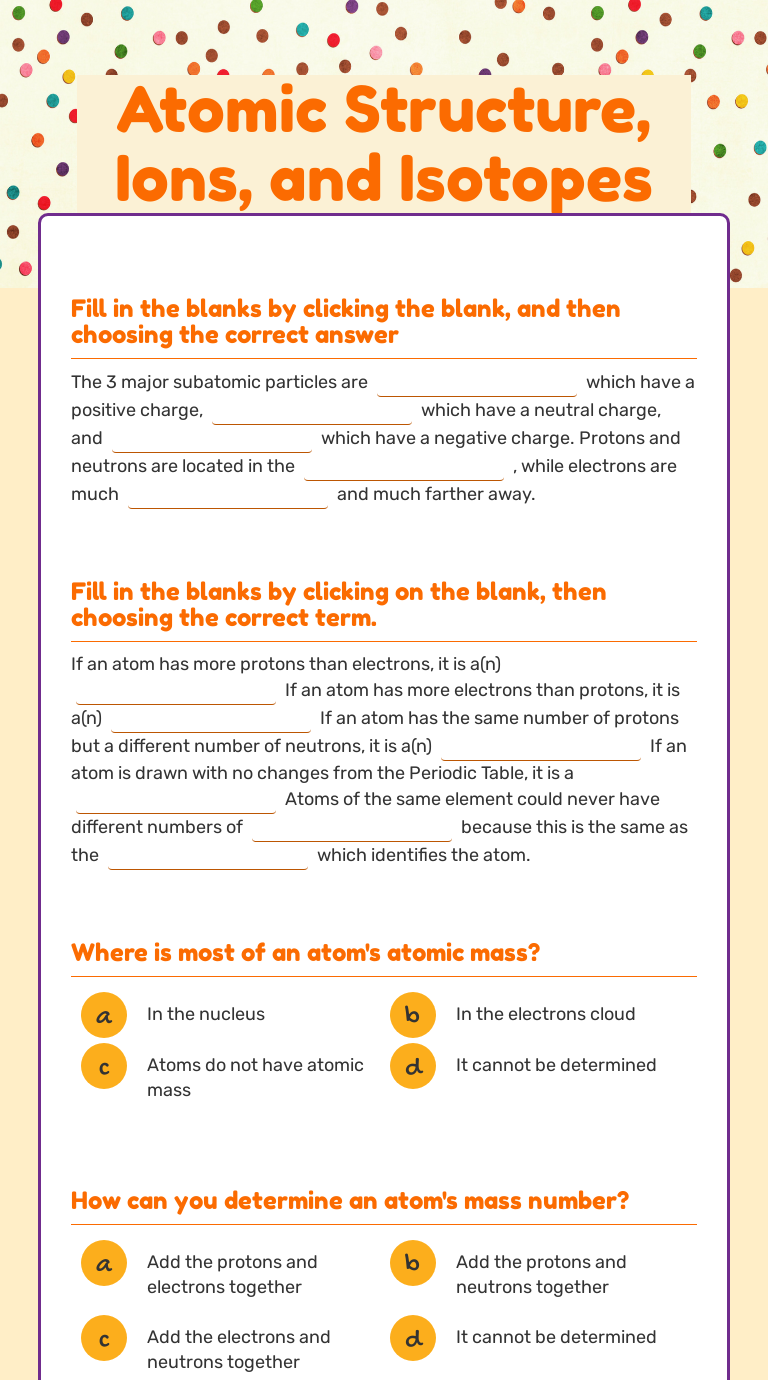 Isotopes Ions And Atoms Worksheet 2 Answers Key - Vegan Divas NYC Jul 05, 2021 · Isotopes ions and atoms worksheet 2 answers key. Protons neutrons and electrons can then organize to form atoms. Refer them to the correct worksheet. 3011 x 1023 atoms 2.