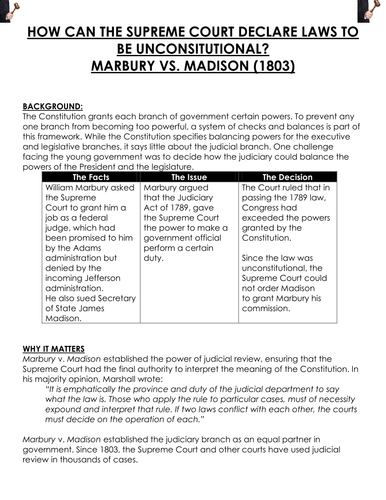 Marbury V Madison Teaching Resources | Teachers Pay Teachers This 1-page handout provides the original Supreme Court ruling as well as the document image for students to analyze with guiding questions for a better understanding of American documents and, in this case, the 1803 Marbury v. Madison case. PDF What Is the Role of the Supreme Court? - Weebly However, the Court held that Marbury's request was not the correct legal remedy. The Judiciary Act of 1789, passed by Congress, authorized original actions in the "It is emphatically the province and duty of the Judicial Department to say what the law is." —Marbury v. Madison, 1803 Why do you think this quote from Marbury v. Madison is