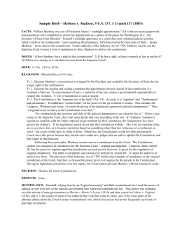 PDF MARBURY v. MADISON - Marco Learning MARBURY v. MADISON MARBURY v. MADISON (1803) AP®U.S. Government and Politics Study Guide FACTS OF THE CASE At the end of his presidency, Federalist John Adams ap- pointed numerous individuals to positions within the govern- ment.