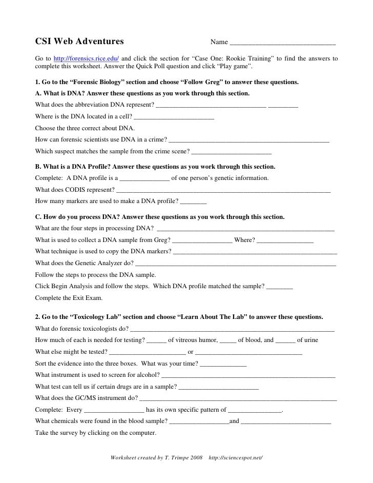 CSI Web Adventures Flashcards - Quizlet Start studying CSI Web Adventures. Learn vocabulary, terms, and more with flashcards, games, and other study tools. PDF Csi web adventures case 1 worksheet Transcript CSI Web Adventures Name _____________________________ Go to and click the section for "Case One: Rookie Training" to find the answers to complete this worksheet. Answer the Quick Poll question and click "Play game". 1. Go to the "Forensic Biology" section and choose "Follow Greg" to answer these questions. A. What is DNA? BibMe: Free Bibliography & Citation Maker - MLA, APA, Chicago, … BibMe Free Bibliography & Citation Maker - MLA, APA, Chicago, Harvard PDF Csi web adventures case 3 student worksheet answer key An answer key is provided for this worksheet. This site is listed on the Forensic Science page at the Kid Zone. CSI Web Adventures - Rookie Training - Students complete this worksheet and learn how evidence is analyzed in a crime lab as they work through the