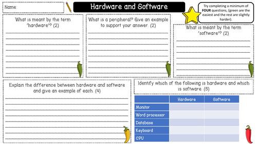 Computer Questions and Answers Laptop help and support. Linux. Memory (RAM) help and support. Mobile device help and support. Monitor, LCD, and display help and support. Motherboard help and support. Mouse and touchpad help and support. Network and network card help and support. Office. MCQ Class 6 Computer Science Hardware and Software MCQs Class 6. January 4, 2022 January 4, 2022 contentwriter. Check the below NCERT MCQ Class 6 Computer Science Hardware and Software with Answers available with PDF free download. MCQ Questions for Class 6 Computer Science with Answers were prepared based on the latest syllabus and examination pattern issued by CBSE, NCERT, and KVS. › ny1541265vbComputer Hardware and Software worksheet Main content: Computer Hardware and Software Other contents: Computer Hardware and Software Add to my workbooks (0) Download file pdf Embed in my website or blog Add to Google Classroom Add to Microsoft Teams Share through Whatsapp Computer Essential 1 Flashcards - Quizlet "Background" software that helps the computer manage resources is called _____. Select one: a. shareware b. application software ... procedures, software, hardware, data, and the Internet. Select one: True False. True. The purpose of software is to convert data into information. ... worksheet files, database files, and presentation files ...