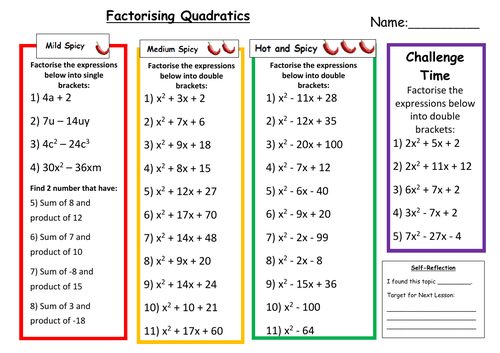 Factoring quadratics worksheet answers. › cms › libCP Algebra 2 Unit 2-1: Factoring and Solving Quadratics ... Factoring and Solving Quadratics WORKSHEET PACKET Name:_____Period_____ Learning Targets: 0. I can add, subtract and multiply polynomial expressions Factoring Quadratic Expressions 1. I can factor using GCF. 2. I can factor by grouping. 3. I can factor when a is one. 4. I can factor when a is not equal to one. 5. Solving Quadratics Through Factorising Worksheets - MME Solving Quadratic Equations by Factorising. Quadratics are algebraic expressions that include the term, x^2, in the general form,. ax^2 + bx + c. If you are on the foundation course, any quadratic equation you’re expected to solve will always have a=1, with all terms on one side and a zero on the other.If you are on the higher course, you may have to do some rearranging in … Factoring and Solving Quadratic Equations Worksheet Factoring and Solving Quadratic Equations Worksheet Math Tutorial Lab Special Topic Example Problems Factor completely. 1. 3x+36 2. 4x2 +16x 3. x2 14x 40 4. x2 +4x 12 5. x2 144 6. x4 16 7. 81x2 49 8. 50x2 372 9. 2x3 216x 18x 10. 4x2 +17x 15 11. Factorising Quadratics Worksheets | Questions and Revision | MME Factorising Quadratics. Quadratics are algebraic expressions that include the term, x^2, in the general form,. ax^2 + bx + c. Where a, b, and c are all numbers. We’ve seen already seen factorising into single brackets, but this time we will be factorising quadratics into double brackets. (nx+m)(px+q) There are 2 main types of quadratics you will need to be able to …