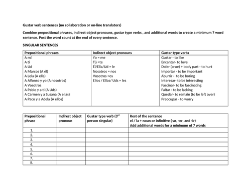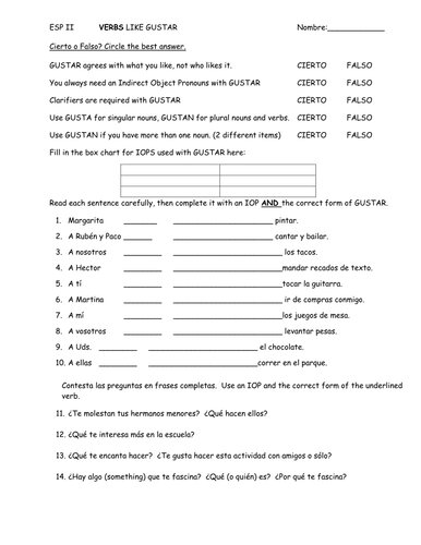 Verb Gustar Teaching Resources | Teachers Pay Teachers Results 25 - 48 of 283 — Also included in: Spanish Gustar Verbs Bundle - 6 Worksheets, Skit, Human Bingo, ... Then answer the questions in a complete sentence.