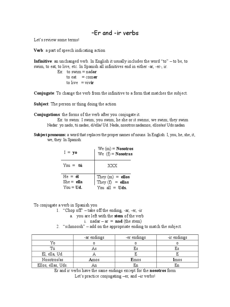 er-and-ir-verbs - Teacher Catalina The verb escrib ir is an -ir verb o let's conjugate it. Rule 1. Get rid of the ending ( -ir ). Let's use our scissors again and let's get rid of that -ir. Poof! ir Verb Endings Chart Now we have the stem ( escrib) and we have to add new endings according to rule #2 and depending on who is speaking. Depending on who is performing the action.