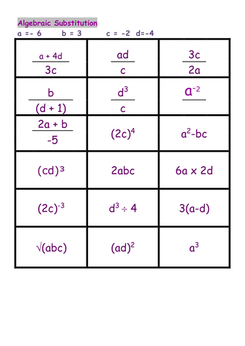 Substitution - free maths worksheets and other resources - DoingMaths Download File Writing and substituting into an algebraic expression A worksheet for pupils to practise creating an algebraic expression and then substituting into it. Can be used as a standalone worksheet or as an extension task for the worksheet above. writing_and_substituting_into_an_expression.pdf Download File