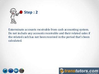 How to convert accrual basis to cash basis accounting — AccountingTools To convert from accrual basis to cash basis accounting, follow these steps: Subtract accrued expenses. If an expense has been accrued because there is no supplier invoice for it, remove it from the financial statements. The easiest source of this information is the accrued liabilities account in the balance sheet.
