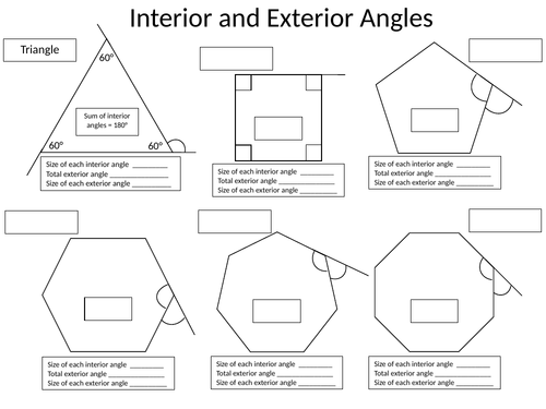 Exterior Angles of Polygons Worksheets - Math Worksheets Center Measure of exterior angle: 180 - measure of each interior angle. Here n is number of sides of the given polygon, n = 3. Measure of each interior angle = sum of all angles ÷ n. So, by using formula: 180( n - 2)/3 = 180( 3 - 2)/3 = 180 × 1/3 = 180/3 = 60°. So exterior angle = 180 - 60 = 120°. View worksheet