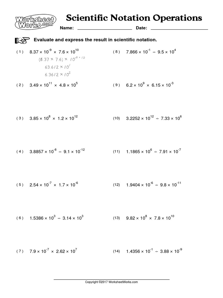 Scientific Notation Operations - WorksheetWorks.com Scientific Notation Operations. Develop skills in working with scientific numbers. This worksheet provides practice in multiplying numbers that are in scientific notation. While it is possible to convert the numbers to decimal form and multiply them, the correct way to do it is to multiply the decimal and exponent parts separately.