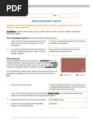 Radioactive Decay And Half Life Worksheets & Teaching Resources | TpT Save time and energy with this ⭐FREE⭐ HALF LIFE WORKSHEET! This set includes 2 worksheets that cover basic half-life calculations and graphing. Use as a homework assignment, end of lesson assessment, or as part of a station activity. I have included the answer key for easy grading. Need a digital Subjects: Chemistry, Physical Science, Physics PDF Half-Life Data-Teacher Answer Key - US EPA Half‐Life Number of Number Radioactive Atoms 0 4000 1 2000 2 1000 3 500 4 250 5 125 Half-Life Data-Teacher Answer Key 1.Hypothesize what half‐lifeis: Half‐life is the amount of time it takes for approximately half of the radioactive atoms in a sample to decay intoa more stable form.