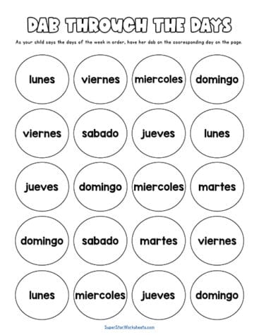 Days of the week in spanish worksheet. 📅 FREE Printable Days of the Week Worksheets for Pre-k ... Nov 16, 2020 · On the first carriage of the trains is the day of the week. Children will need to cut and paste the days of the week in order after this one. days of the week worksheet for kindergarten. The third days of the week worksheet pdf activity is a list of the days of the week which children will need to trace. This could be used as a full page, or ... Days of the Week Worksheets - Superstar Worksheets These free printable Days of the Week worksheets are a must have for your calendar lesson plan! Students will learn the order of the week, how to spell the days of the week, what the abbreviations are, and so much more! For more exciting worksheets, look here! Days of the Week Worksheet for Kindergarteners Days and Months in Spanish Apr 08, 2022 · The days of the week in Spanish are Masculine so we say: el lunes, el martes, el míercoles, el jueves, el viernes, el sábado, el domingo. Note however that when we talk about the days in plural, as in Mondays or Fridays, only sábado and domingo have an S added in plural form. Free Spanish 1 Curriculum Homeschool - Joy and Valor Life Jun 10, 2020 · Week 35: Take Notes. Monday: 100 Phrases Every Spanish Beginner Must-Know. Tuesday: Watch again and practice saying out loud. Wednesday: Watch again and practice saying out loud. Thursday: Watch again and practice saying out loud. Friday: Culture- Travel Mexico on a Budget Video Handout Week 36: