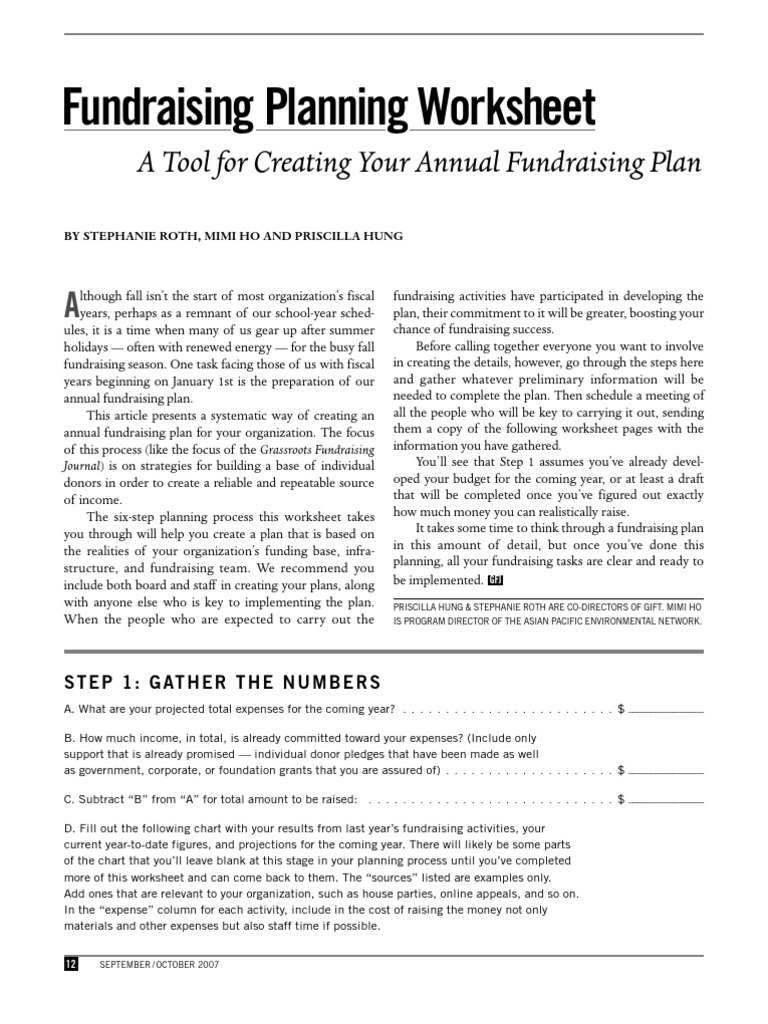 Fundraising Planning Worksheet - Non Profit News - Nonprofit Quarterly The six-step planning process this worksheet takes you through will help you create a plan that is based on the realities of your organization's funding base, infrastructure, and fundraising team. We recommend you include both board and staff in creating your plans, along with anyone else who is key to implementing the plan. 6+ Charity Event Planning Templates in PDF | Free & Premium Templates 5 Steps to Create Event Planning Format, Step 1: Fundraising Goals, You must raise the goals and the objectives that will help in the fundraising events and the program. The goals and objectives of the events aim to promote the fundraising from the donors and the patrons.